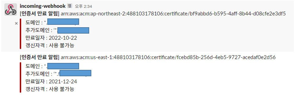 "text": "*[인증서 만료 알림]* %s "% (arn),