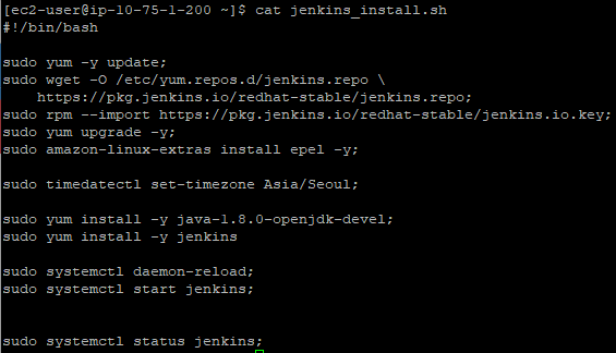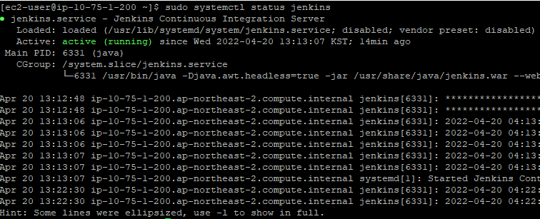 마지막의 jenkins의 status를 출력하는 명령어가 작성되어 있기 때문에 아래와 같은 화면이 나오면 설치가 완료 되었다고 보면 됩니다.