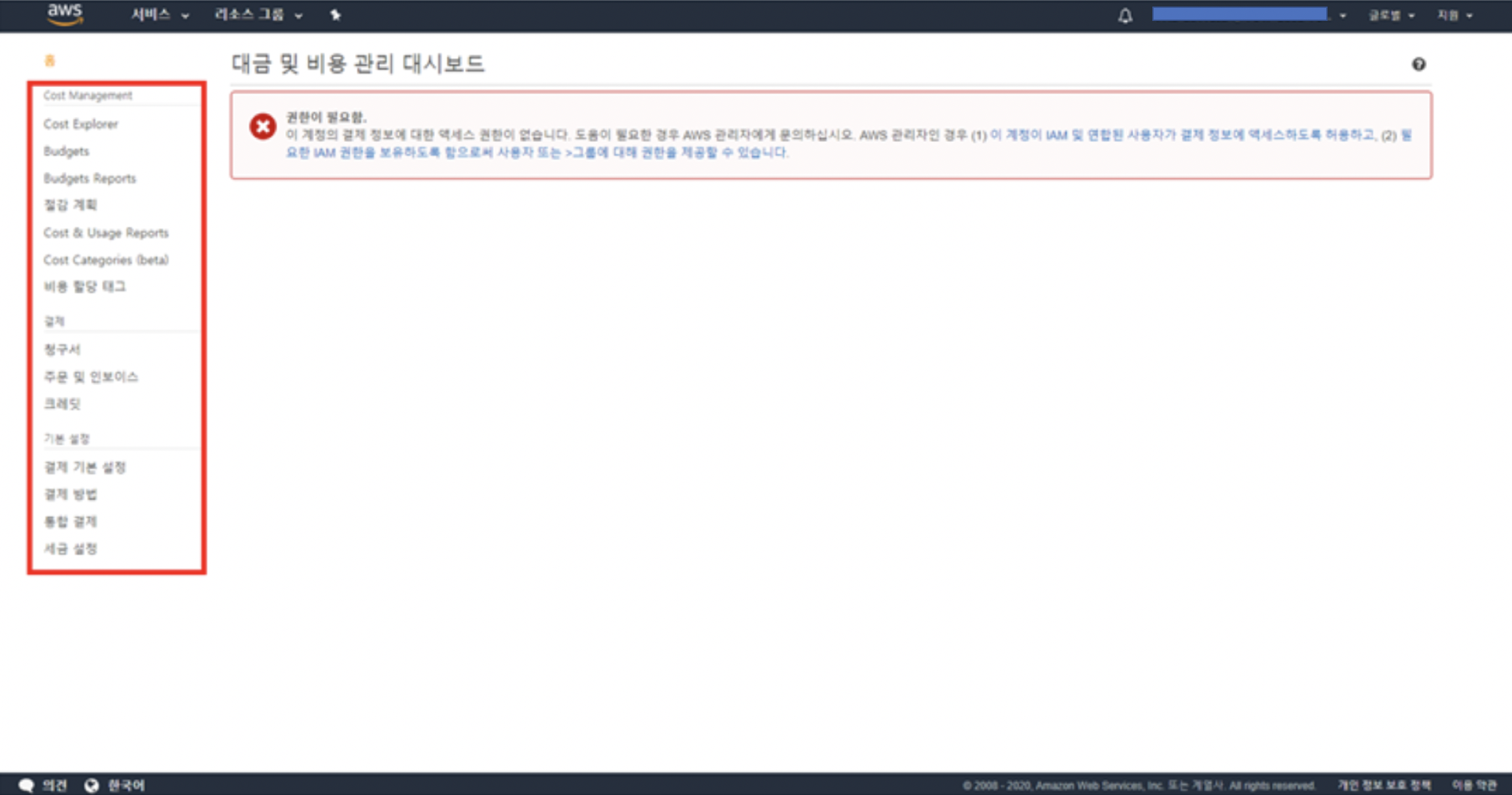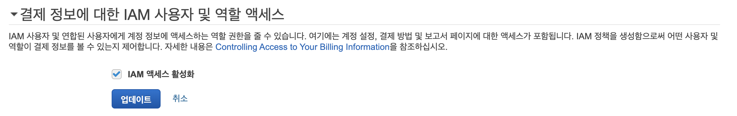 스크롤 중간쯤에 결제 정보에 대한 IAM 사용 및 역할 엑세스 타이틀이 보입니다. 클릭해서 IAM 액세스 활성화 > 업데이트 클릭을 하면 위에서 보였던 권한 필요 화면 대신 결제 대시보드 화면이 보입니다.