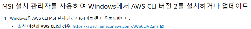 이전글 중에 Mac OS에 AWS CLI 설치하기 글이 있습니다. Windows PC를 통해 AWS CLI를 설치하여 사용할 일이 생겨 Windows PC에 AWS CLI 설치하기 글을 작성하게 되었습니다. AWS CLI 사용 방법은 이전 Mac OS에 AWS CLI 설치하기 글에 설명이 되어 있으니 참고 부탁드립니다. longtermsad.tistory.com/13 Mac OS에 AWS Cli 설정하기 AWS Cli 란? AWS 커맨드 라인 인터페이스(AWS Command Line Interface, aws cli)는 AWS 서비스를 관리하는 통합 도구입니다. 여러 AWS 서비스를 명령줄에서 제어하고 스크립트를 통해 자동화할 수 있습니다. 설 longtermsad.tistory.com 설치(Window..